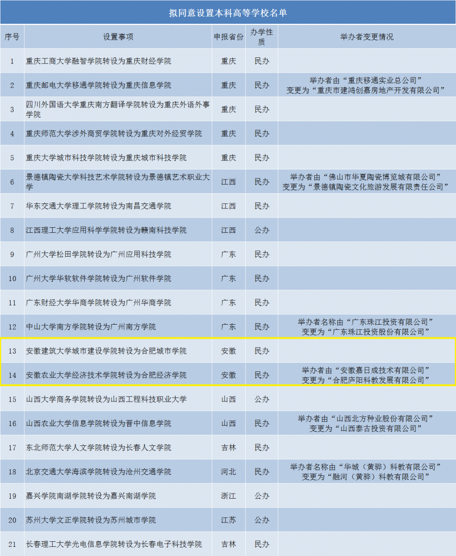教育部官宣!全国21所高校正式转设更名,安徽有2所!